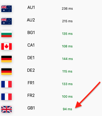 Mira el tiempo de ping (ms) junto a cada servidor. Los tiempos de ping más cortos generalmente indican una respuesta más rápida del servidor desde tu ubicación actual. Toca un servidor para conectarte a él.